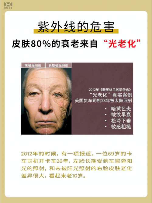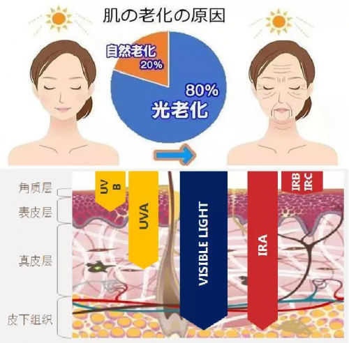 UVA会直接到达真皮层造成胶原蛋白流失/UVB会让我们皮肤晒伤晒黑(80%的老都是光老化造成,所以防晒一年四季)